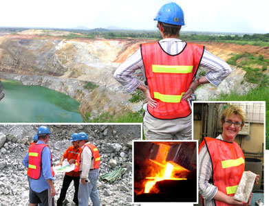 Chatree mine visit  - Following a briefing at the Chatree mine office, the group was given on overview of the operation from the lookout above the CH Pits (upper image), before being taken down into the D Pit (lower 3 images to the left) and then the A pit where the oxide zone and exposure are observable. After the pit visit, the group was shown a gold pour and the resultant silver-gold dore bars. The mine visit was hosted by the Geology Manager, Suphanit Suphananthi (on the right in the second image from the left).