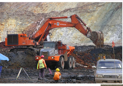 Sepon Mines  - Following the briefings and core inspection, the remainder of the day was spent in the gold and copper mines of the Sepon Mineral District with Paul Quigley and Dan Oldeberg. Left: mining supergene chalcocite clay in the Khanong pit. Right: in the upper benches of the Discovery West carbonate hosted "invisible gold" pit. On the following day the group returned to Bangkok.